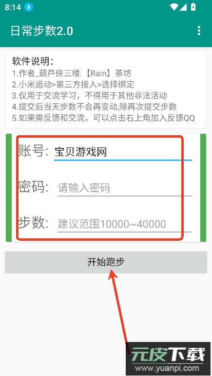 3、在相应位置输入账号、密码以及目标步数等信息,最后点击开始跑步按钮即可。