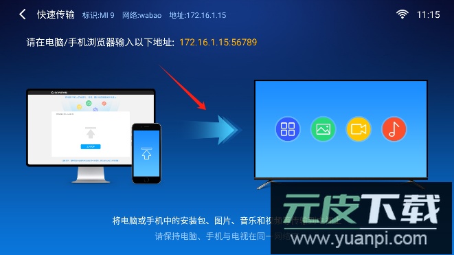 3、借助局域网安装:在电视上安装好该软件后,可利用其“多屏互动”功能与电脑或手机进行文件传输;进入“快速传输”模式,在电脑或手机浏览器中输入电视的IP地址,就能将文件发送至电视;传输结束后,打开小白文件管理器找到对应的APK文件进行安装。