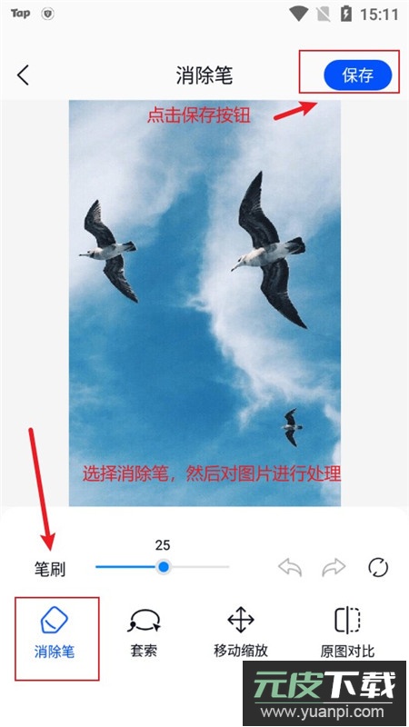 4、点击消除笔,你可以通过调整笔刷的大小对消除的区域进行灵活设置,完成后点击“保存”按钮即可;