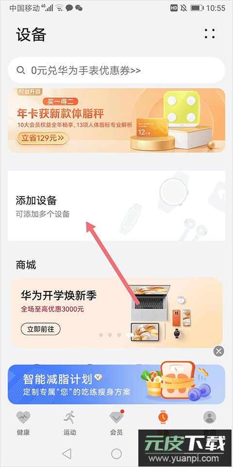 2、在运动健康应用的设备页点击【添加设备】,将手表配对并连接;