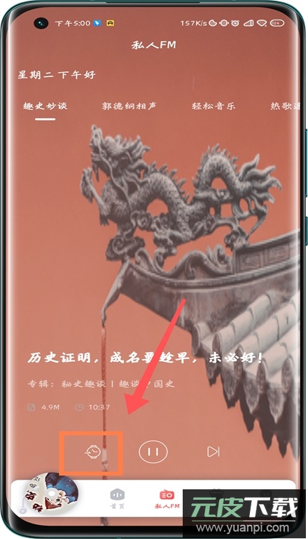 6、私人FM页面的推送图标位于播放按钮旁边。