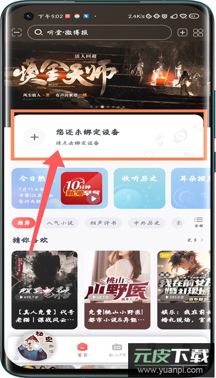 3、运动健康应用与手表连接成功后,打开喜马拉雅穿戴应用并登录,进入首页点击【绑定设备】;