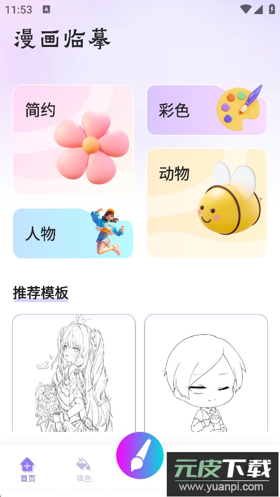 1、豆画App主要提供两大功能板块,分别是绘画与填色。