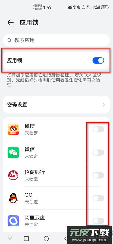 5、开启应用锁后,可对指定软件右侧开关进行设置。
