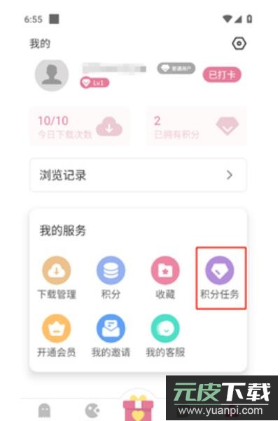 2、进入我的页面后,点击页面右下角的积分任务选项进入对应页面;