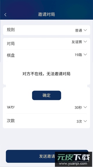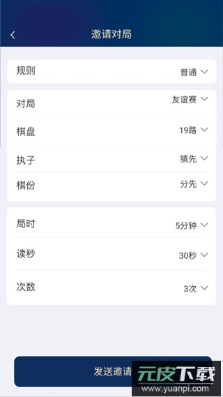 4、设定对局规则、模式、棋盘路数、执子顺序、棋份、局时与读秒次数,点击邀请即可开始。