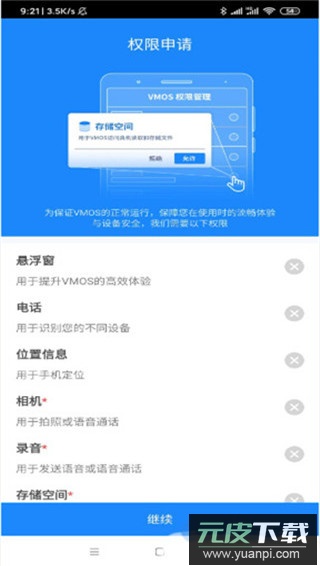 2、获取所需的六大手机权限,包括悬浮窗、电话、位置信息、相机、录音及存储空间等;