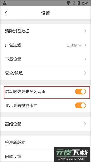 找到“启动时恢复未关闭网页”选项,将滑动按钮向右开启即可。