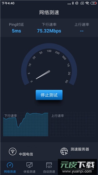 点击开始测试按钮后,界面会显示下行与上行速率的实时变化曲线,底部则展示当前网络地址及所使用的测速服务器信息。