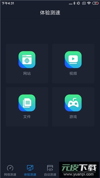 体验测速区分为网站访问、视频播放、文件下载、游戏延迟四大板块,用户可按实际使用场景选择相应测试项目。