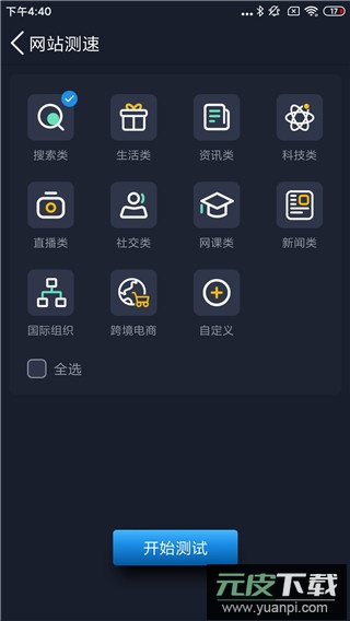 例如在网站测试中,可选择搜索、生活、资讯等类别,支持单选或多选;用户也可自行输入网址进行特定测试,灵活性较高;该功能模拟真实使用场景,更能反映实际网络体验。