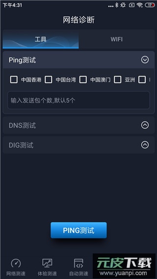 诊断功能分为工具与WiFi两部分;工具栏目提供Ping测试、DNS测试、DIG测试三项专业工具,其中Ping测试支持测量中国至全球六大洲的链路性能,包括时延与丢包率统计。
