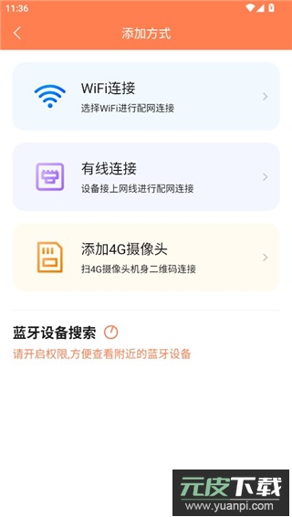 2. 软件提供多种添加方式,包括WiFi连接、有线连接、添加4G摄像头及蓝牙设备搜索等,任选其中一种。