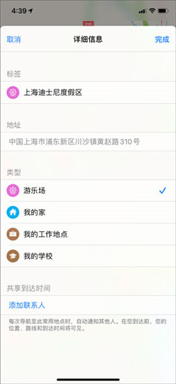 4、进入详细信息页,选择地点类型并添加联系人后,点击完成
