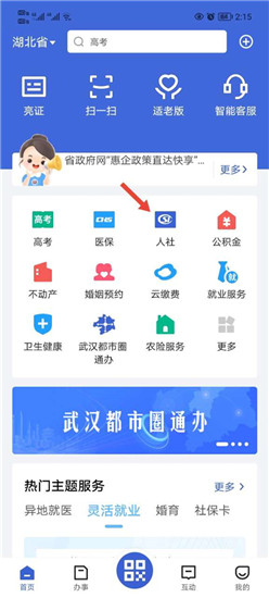 首先打开应用,点击选择“人社”服务。