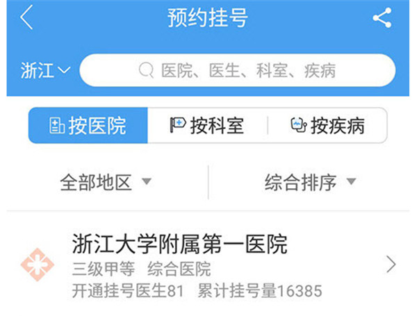 2、在预约挂号页面,用户可以按医院、科室或疾病类型来筛选医生。