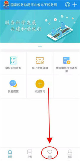 1、下载安装应用,打开后进入首页,点击“服务”选项;