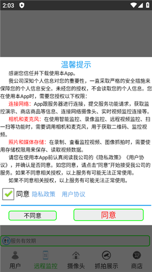 1、首次使用需同意隐私条款,并授权获取拨打电话与管理通话权限(用于读取设备ID作为监控标识)、相机与麦克风权限(用于视频监控);授权后屏幕顶部将显示本机监控ID及对应的二维码
