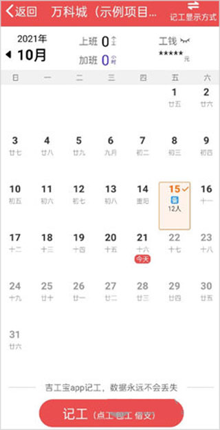 1、打开app进入首页后找到【记工】入口点击进入,选中需要记录工时的日期,再次点击页面内的【记工】按钮;