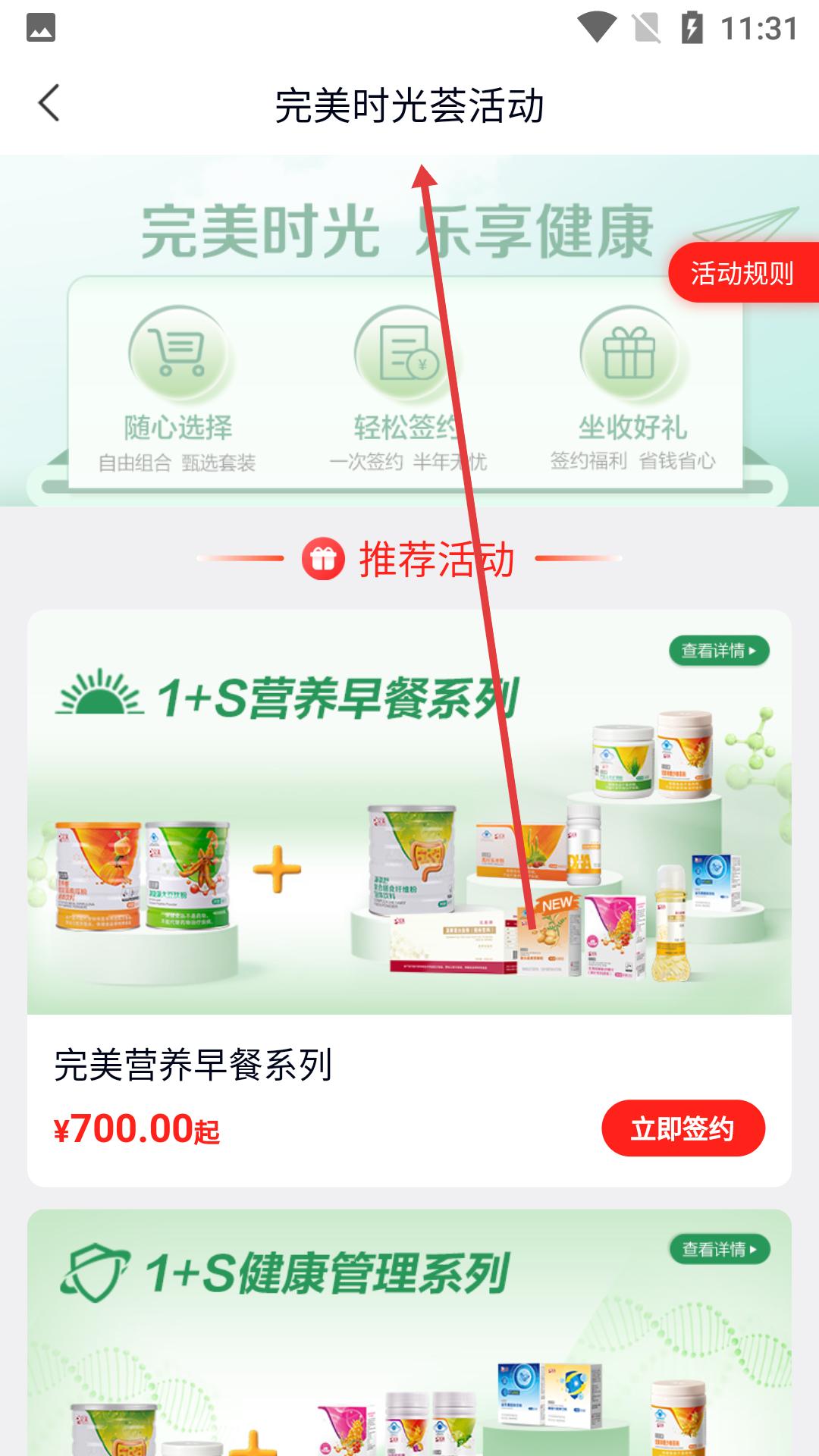 2、点击进入完美时光荟活动页面,页面以完美时光,乐享健康为主题,有营养早餐等各类推荐活动,大家可以根据自身需求签约选购;