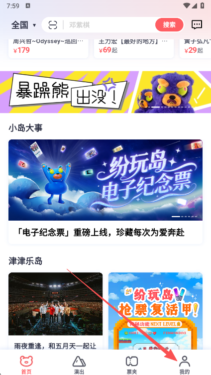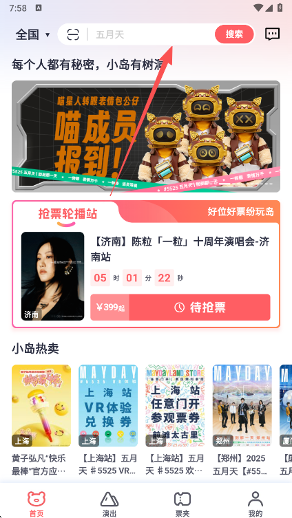1、打开纷玩岛应用,在首页找到抢票专区,或通过顶部搜索框直接输入想看的演唱会名称。