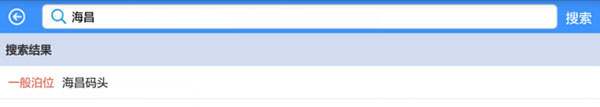 1、点击右上角的放大镜图标进入搜索栏,直接输入目的地的中文关键字、拼音,或目标船舶的MMSI码、中文船名、拼音,点击搜索即可。例如查找江都港海昌码头,只需输入“海昌”关键词并搜索。
