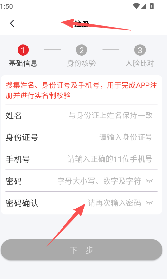 2、填写个人基本信息,点击身份核验并按照指引完成人脸识别认证,即可成功注册。