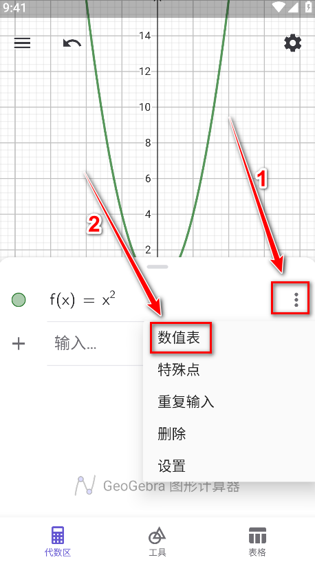 4. 在加号图标右侧的输入框中直接键入函数表达式,例如输入f(x)=x^2,随后即可在绘图区看到对应的函数图像生成。