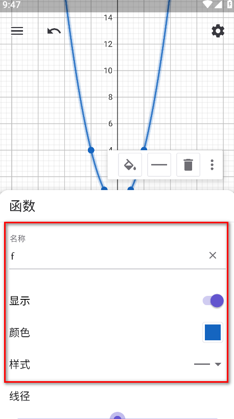 10. 在弹出的编辑选项中,可以修改函数的名称、线条颜色、线型样式等属性。