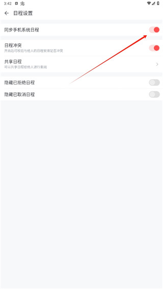 跳转到日程设置页面后,点开是否同步手机系统日程的开关按钮即可;