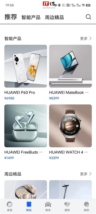 5、精选版块属于购物频道,用户可以购买华为旗下各类产品,还有四款智选周边产品可供选择;