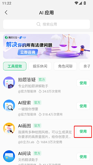 3、在应用列表里,点击“AI画图”功能右侧的“使用”按钮。