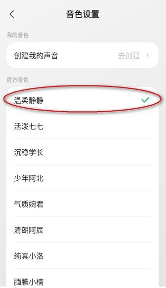 2、接着在音色列表中勾选自己想要使用的声音,例如“温柔静静”。