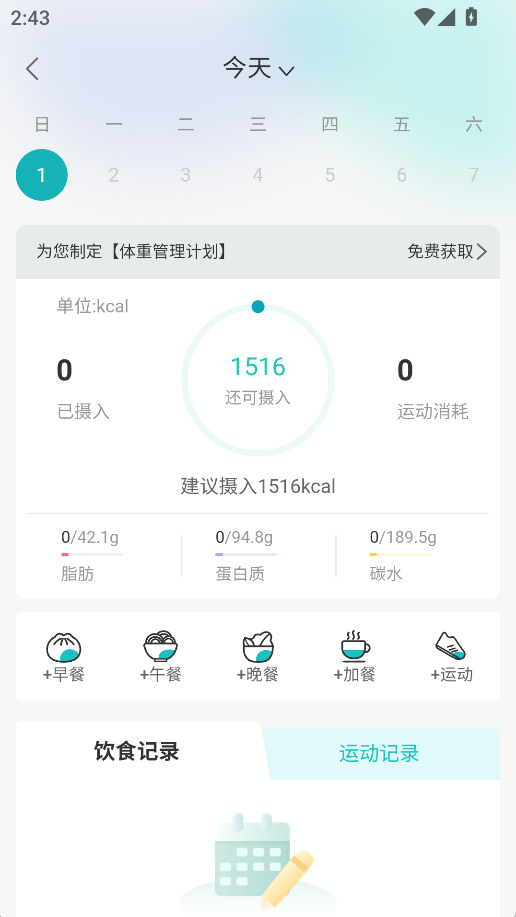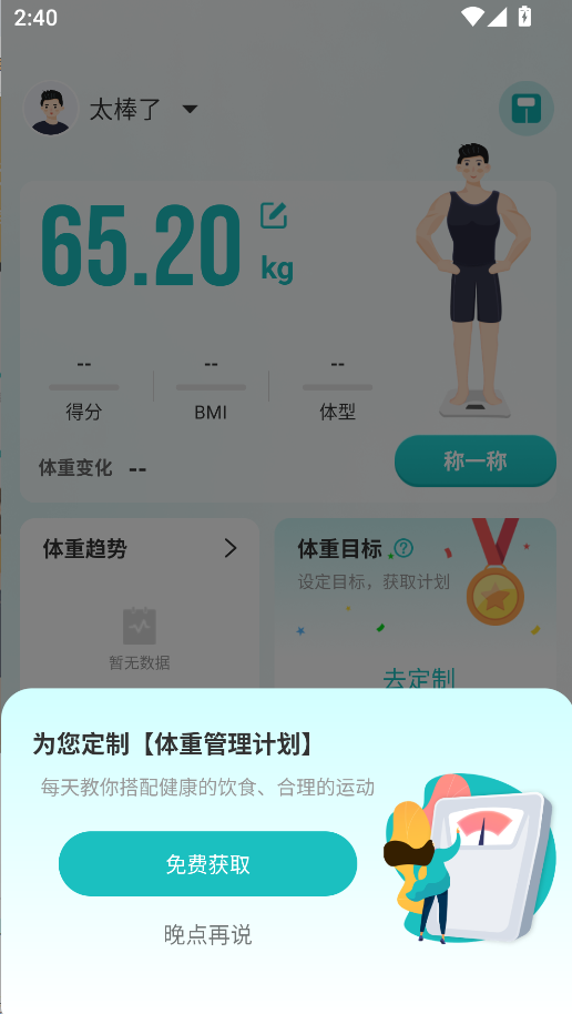 2、首次注册使用的用户,可以免费享受定制体重管理计划的服务,系统会结合你的各项身体指标和设定的目标体重,生成科学可落地的健康管控方案;