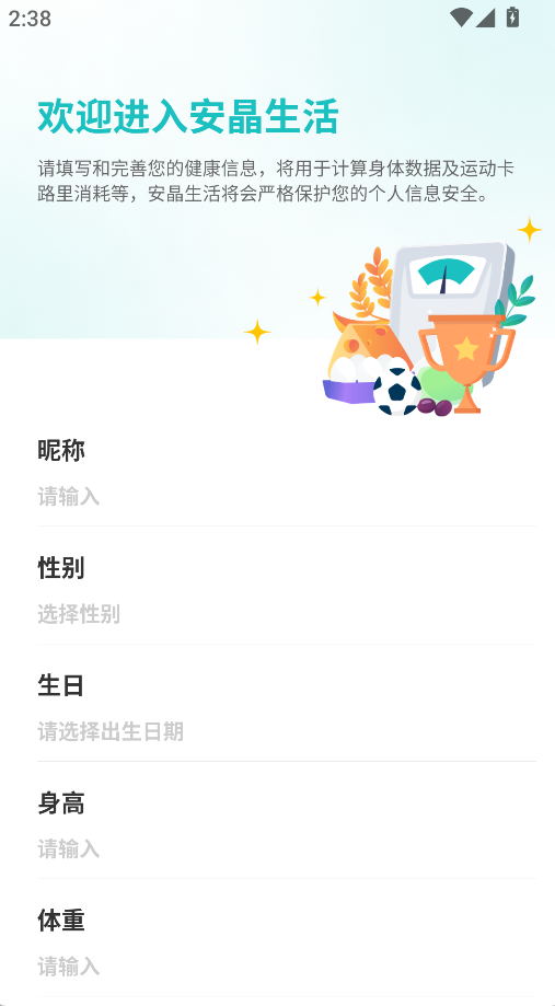 1、打开app之后,跟着系统引导逐项填写个人基础信息,包含昵称、性别、生日、身高以及初始体重,系统会结合这些数据生成你专属的个人健康档案;