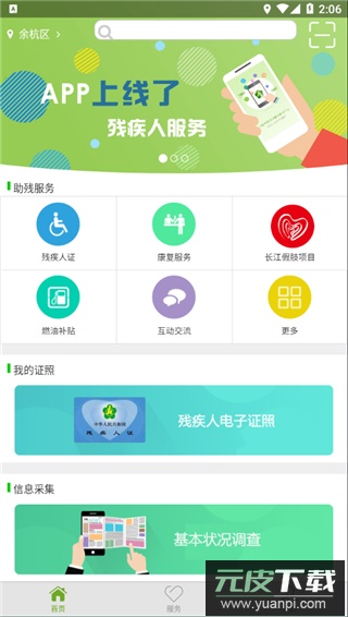 1、打开残疾人服务app,首页集中展示多项服务功能;