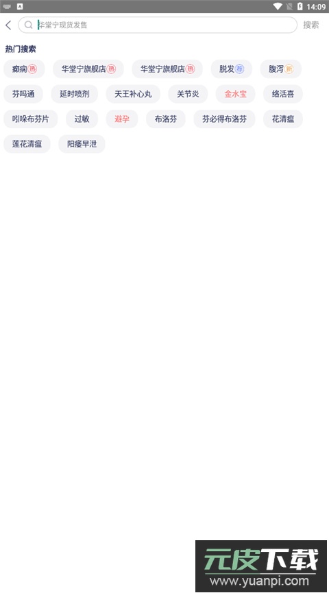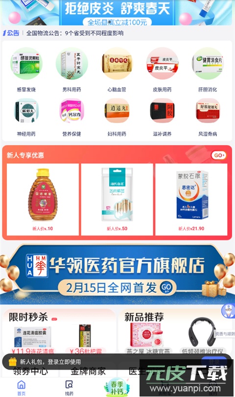 2、登录后首页会显示感冒发烧、心脑血管、皮肤用药等常见药品分类,用户也可以在顶部的搜索框直接输入需要的商品名称进行查找;