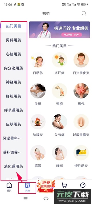 1、在app内进入“找药”页面,可以根据疾病科室或具体病症来筛选需要购买的药物;