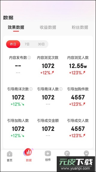 效果数据汇总近期内容表现,支持按昨日、7日、30日筛选;收益数据提供不同时间维度及订单状态的收入分析;粉丝数据展示当日粉丝动态与增长情况。
