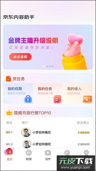 平台公告区域按运营配置顺序轮播展示,点击可查看详情;京任务模块用于查看权限、任务列表及近期收益;视频月榜则展示上月表现优异的达人排名。