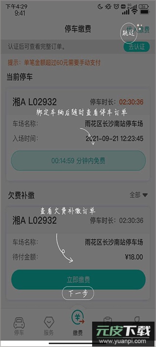 3、绑定车辆后可随时查看停车订单与欠费补缴记录。