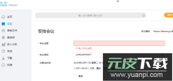 3、点击安排会议,填写会议主题、日期、时间与密码等信息;