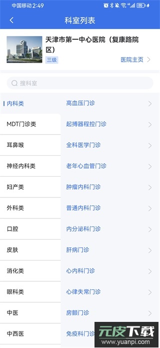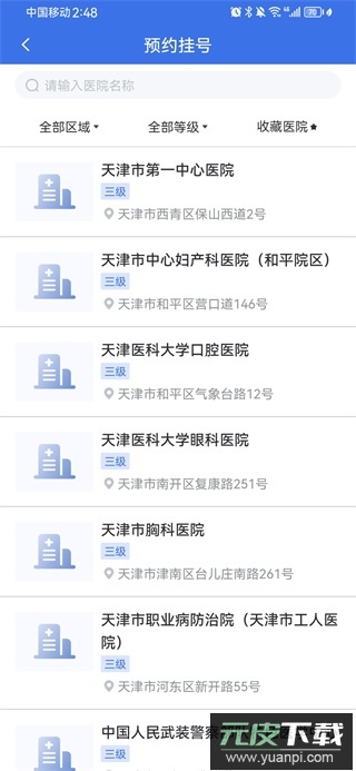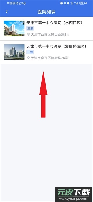 2、页面将显示天津市所有医院列表,根据需求选择目标医院。