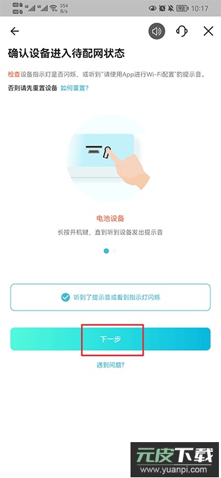 3、根据提示将设备通电并启动,在听到提示音后点击下一步继续操作;