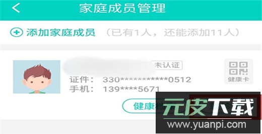 2. 进入家庭成员管理页面后,在成员信息区域的右下角可见“就诊卡”选项;通过该功能可以绑定本人及每位家庭成员的就诊卡。