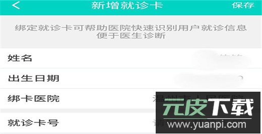 3. 点击就诊卡按钮后,首先选择持有就诊卡的对应医院;确认姓名与出生日期无误后,输入医院提供的就诊卡编号,最后点击保存即可完成绑定。