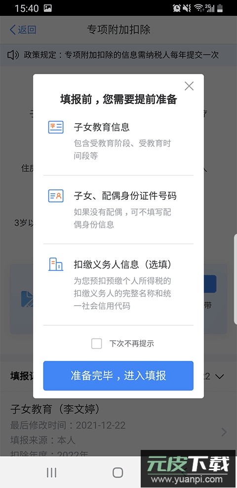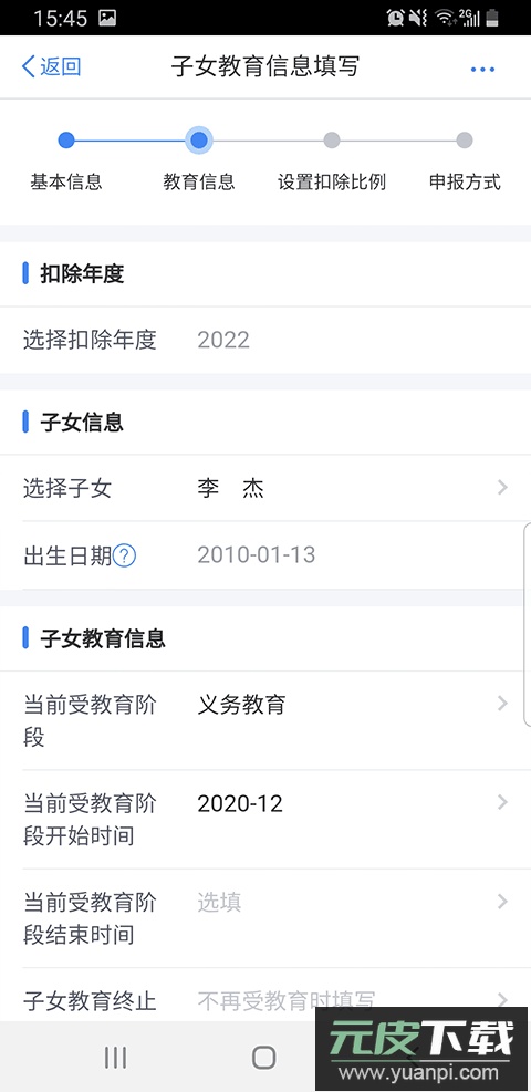 7. 选择扣除年度、子女信息、教育阶段与就读时间;