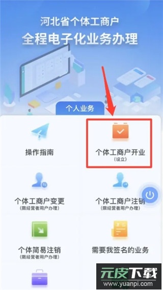 第二步:进入业务办理界面,选择个体工商户开业登记功能