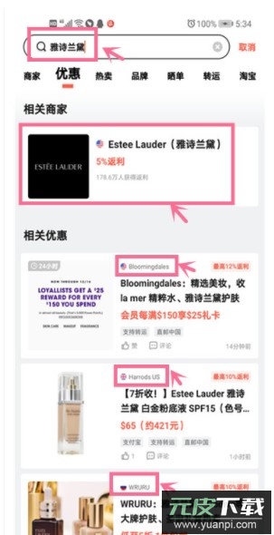 1. 若用户想购买特定商品但不确定何处有折扣,可直接在应用内搜索关键词,例如输入“雅诗兰黛”;