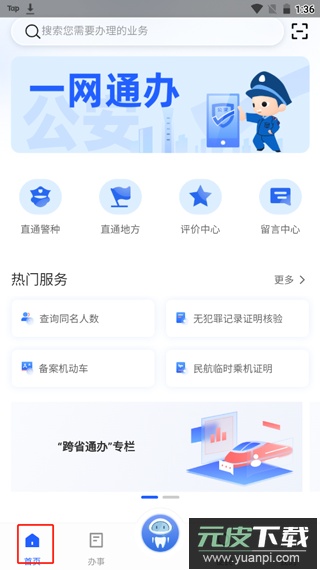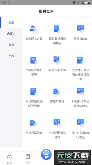 1、启动应用后进入首页,可看到查询同名人数、备案机动车、核验无犯罪记录证明、申请民航临时乘机证明等多种功能;